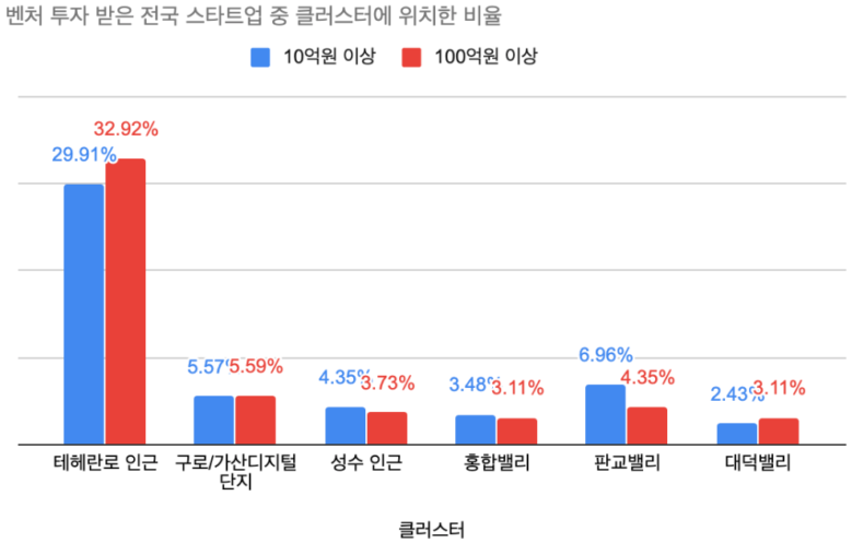 또 테헤란로는 10억 이상 투자 받은 스타트업 172개, 100억 이상 53개로 명실상부 한국을 대표하는 스타트업 벨트라는 점을 알 수 있다. 하드웨어 스타트업이 많은 구로 가산디지털단지 지역의 경우 10억 이상 32개이며 소셜벤처가 밀집한 성수 지역은 25개, 콘텐츠 스타트업이 많은 홍합밸리도 20개로 클러스터로 성장해나가고 있다. 100억 이상 투자 받은 스타트업이 이들 클러스터에 소재하는 비율도 비슷하다.