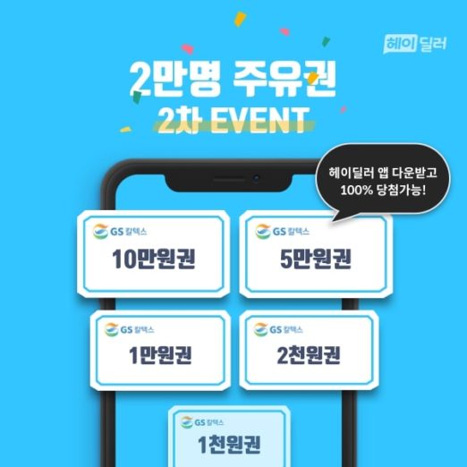 이번 주유권 이벤트는 시간대별로 선착순 2만 명에 지급하며 구글 플레이스토어 혹은 앱스토어에서 헤이딜러 앱을 다운로드 받은 다음 누구나 참여할 수 있단 소개다. 이벤트는 19일 오전 11시 시작하며 GS칼텍스 10만원 주유권, 5만원 주유권, 1만원 주유권, 2천원 주유권, 1천원 주유권을 추첨을 통해 지급한다. 당첨 결과는 헤이딜러 앱 내 룰렛을 돌려 바로 확인할 수 있다. 이벤트는 1명 당 1회만 참여할 수 있으며 주유권은 1주일 안으로 모바일 기프티콘으로 지급된다. 이벤트에 대한 자세한 내용은 헤이딜러 앱에서 확인할 수 있다.