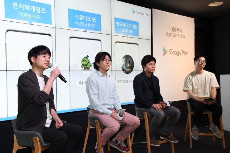 19일 열린 구글플레이 개발자와의 대화에는 올해 열린 구글플레이 인디게임 페스티발 TOP3 개발사가 참여했다. 학생이자 인디 게임 개발사로 투잡 생활을 하고 있는 이유원 반지하게임즈 대표를 비롯해 육아와 게임 개발을 병행하는 박성필 스튜디오 냅 대표, 15년 동안 룸즈 시리즈를 개발한 김종화 핸드메이드 게임 대표다. 학교에서, 아이와 함께, 15년 동안. 저마다의 사연을 지닌 게임 개발기를 소개한다.