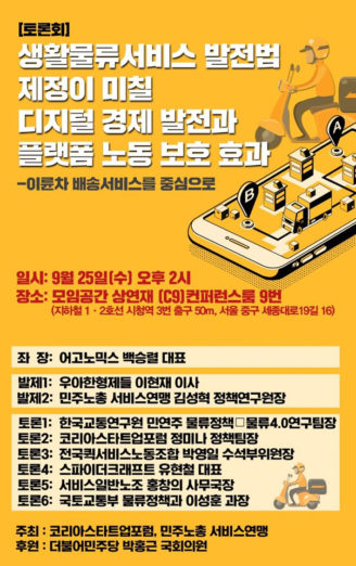 9월 25일 오후 2시부터 서울 중구 상연재에서 개최되는 본 토론회는 ‘생활물류법서비스 발전법이 디지털경제 발전과 플랫폼 노동 보호 효과’를 주제로 이륜차 배송서비스에 주안점을 두고 진행될 예정이다.