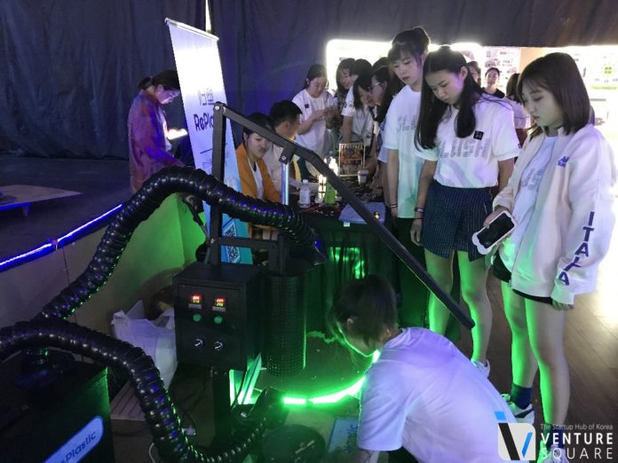 참관객 줄이 길게 늘어선 곳은 리플라스틱. 리플라스틱은 플라스틱 병뚜껑을 즉석에서 열쇠고리로 만들어주고 있었다. 플라스틱 병뚜껑 중 마음에 드는 색깔을 고른 뒤 돌고래, 뼈다귀 등 원하는 모양을 고르면 압축 틀을 이용해 현장에서 제품을 찍어낸다. 열쇠고리뿐 아니라 컵받침, 휴대폰 케이스로도 제품을 만나볼 수 있다. 바로 앞에 자리 잡은 플라스틱 에콜로지콜 트랜스포메이션은 페트병이 상품으로 재탄생되는 과정을 전시했다. 참관객은 잘게 부순 플라스틱과 이를 이용해서 만든 섬유, 섬유로 만들어진 옷가지와 가방, 인형 등을 손으로 직접 만져보며 업사이클링을 실감했다.