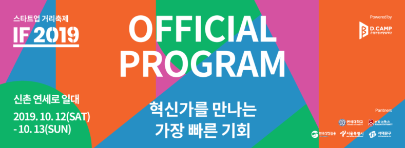◇ [10월 12~13일] = IF 2019 INNOVATION CONF = 은행권청년창업재단 디캠프가 개최하는 스타트업을 위한 최대 길거리 축제인 ‘IF 2019’ 페스티벌이 오는 10월 12~13일 이틀간 서울 서대문구 신촌 연세로 일대에서 펼쳐진다. 올해 3회를 맞는 이번 축제는 ‘일상의 혁신’을 주제로 100여개 이상의 스타트업과 유관기관이 참여할 예정이며 △스타트업과 일반인들을 연결시켜주는 스타트업 부스인 ‘스타트업 빌리지’ △유관 직무 멘토들을 네트워킹해주는 디파티 △인사이트를 받고 거래까지 이어질 수 있도록 해주는 새로운 개념의 콘퍼런스 ‘IF이노베이션콘’ △대학생 대상 데모데이인 ‘예스(Y.E.S.) 데모데이’ △네트워킹 파티를 포함한 다채로운 행사를 진행할 예정이다.