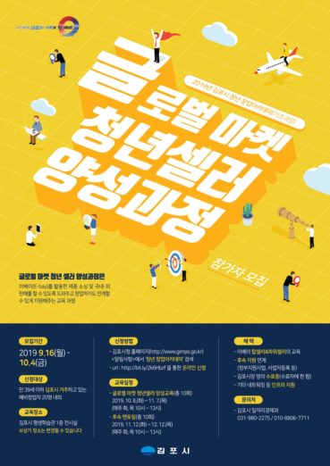 ◇[10월 8일 화요일] = 김포시 글로벌 마켓 청년셀러 양성과정 = 김포시가 오는 8일 개강하는 2019년 김포시 청년 창업아카데미 ‘글로벌 마켓 청년셀러 양성과정’의 참여자를 모집한다. 글로벌 마켓 청년 셀러 양성과정은 이베이를 활용한 제품 소싱 및 국내외 판매에 나설 수 있도록 돕고 창업까지 연계하는 교육과정. 이번 아카데미는 2019년 하반기 기초과정으로 이베이(E-bay)를 기반으로 글로벌 마켓 청년셀러를 양성하는 과정이며 글로벌 셀링 이해, 아이템 소싱 및 공급처 찾기, 해외트렌드 및 경쟁사 조사, 상품등록 실습 등 총 10일의 창업 전문강의 이후 사업자등록, 상품 리스팅 및 배송, 지역기업 연계 판매방법 등으로 창업까지 연계할 수 있게 지원해 주는 후속 멘토링도 운영한다.