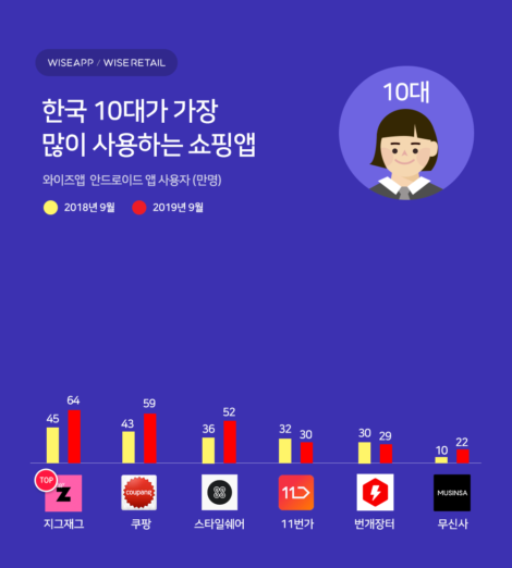 와이즈앱이 지난 9월 한국 안드로이드 스마트폰 사용자의 세대별 쇼핑앱 사용 현황을 발표한 결과 쿠팡이 9월 한 달간 1,132만 명이 이용하며 국내 쇼핑몰 사용자 순위 1위를 차지했다. 이어 11번가 630만 명, 위메프 451만 명, G마켓 435만 명의 순이었다.