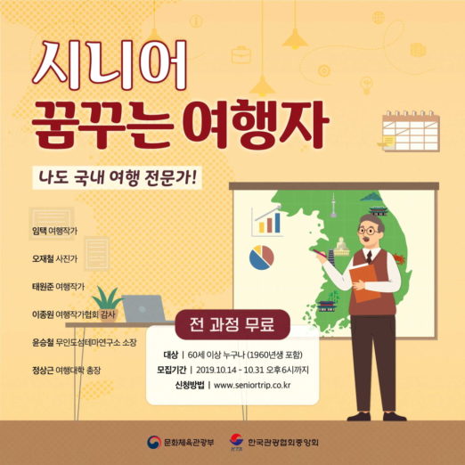 이번 과정은 60세 이상 액티브 시니어를 대상으로 한 여행 문화 교육 프로그램. 7주에 걸쳐 여행전문가 멘토링과 단체 토의 등으로 진행된다. 임택 여행작가, 오재철 사진작가, 김승진 해양모험가, 이종원 여행작가협회 감사, 윤승철 무인도섬테마연구소 소장, 정상근 여행대학 총장 등이 강사로 나설 예정.
