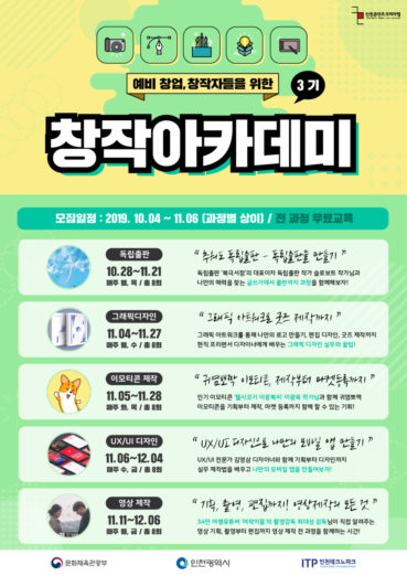 10월 28일 독립출판을 시작으로 각 과정은 11월 11일까지 순차 개강하며 과정별 32시간 교육으로 운영한다. 자세한 내용은 인천콘텐츠코리아랩 운영사무국으로 문의하면 된다.
