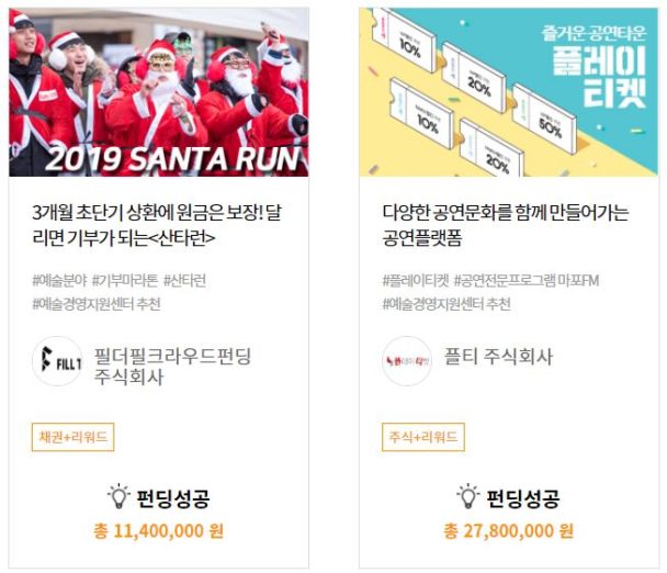 예술분야 투자형 크라우드펀딩 지원사업은 오픈트레이드가 예술경영지원센터와 함께 진행하는 사업으로 오픈트레이드내 전용관을 마련, 전문 심사단 평가를 거친 10개 셰술스타트업이 축제, 공연, 플랫폼에 관한 투자형 펀딩을 열게 한다. 이번 펀딩에 성공한 필더필과 플티는 각각 기부 마라톤 ‘산타런’과 중소공연 예매 플랫폼 ‘플레이티켓’을 선보인 바 있다. 이를 통해 필터필은 목표액 1,000만 원을 넘어선 1,140만 원을 모았으며 플티는  2,780만원을 모으며 목표액 93%를 달성했단 소개다.