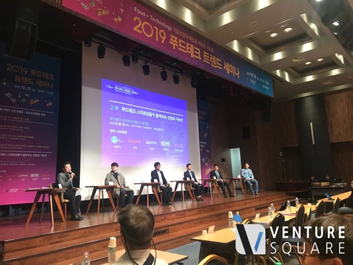농림축산식품부가 개최한 대한민국식품대전이 25일 서울 양재동 aT센터에서 마지막 날을 맞았다. 5층 그랜드홀에서는 푸드테크 트렌드 세미나를 마련, 최근 국내서 주목 받는 푸드테크 스타트업 대표 5인을 한자리에 모았다. 라운드 테이블에 앉은 이는 이문주 쿠캣 대표, 양재식 더플랜잇 대표, 전성균 혼밥인의만찬 대표, 김민수 더맘마 대표, 공경율 리테일영 대표. 자리를 통해 좌장으로 나선 전화성 씨엔티테크 대표는 푸드테크 트렌드에 대한 논의를 이끌기 시작했다.