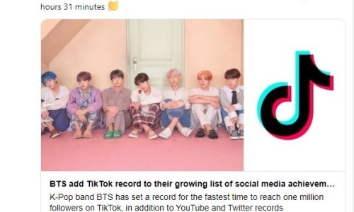 BTS가 틱톡을 통해 최단기간에 팔로워 100만을 달성하는 기록을 세웠다는 것. 방탄소년단은 지난 9월 25일 틱톡에 계정을 개설한 지 불과 3시간 31분 만에 팔로워 100만 명을 돌파해 가장 빠른 기간에 틱톡 팔로워 수 100만 명 달성이라는 타이틀을 거머쥐었다.