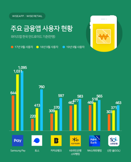 올해 9월 사용자가 가장 많았던 국내 금융 결제앱 1위는 삼성페이인 것으로 나타났다. 와이즈앱과 와이즈리테일이 발표한 9월 한국 안드로이드 스마트폰 기준 금융/결제앱 사용현황에 따르면 삼성페이는 총 1,095만 명이 사용하며 1위에 올랐다. 2위는 ‘토스’로 지난해 9월 413만 명에서 올해 9월 760만 명으로 작년 동월 대비 사용자가 84% 증가했다. 3위는 ‘카카오뱅크’으로 작년 9월 370만 명에서 올 9월 597만 명으로 작년 동월 대비 사용자가 61% 증가했다.