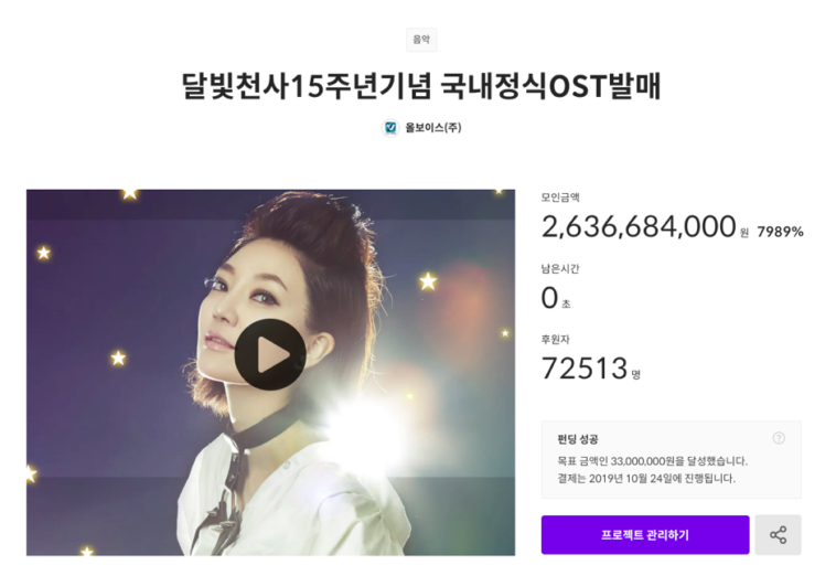 텀블벅은 지난 9월 27일 시작한 달빛천사15주년기념 국내정식OST발매 프로젝트가 1개월 만에 후원자 7만명 이상에게 후원액 26억원 이상을 모금했다고 밝혔다. 텀블벅 측에 따르면 국내 크라우드펀딩 역대 최다 금액 모집이라는 설명이다.