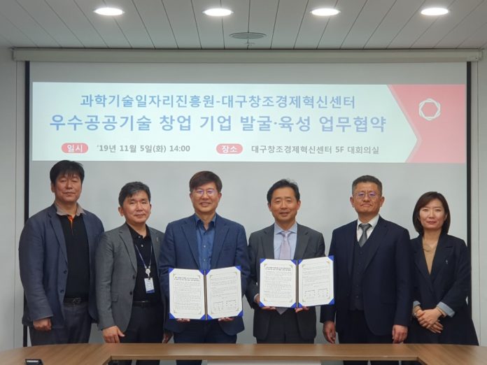 대구창조경제혁신센터가 11월 5일 과학기술일자리진흥원과 우수공공기술 발굴과 고도화, 기술 이전 활성화를 위한 업무협약을 맺었다고 밝혔다.