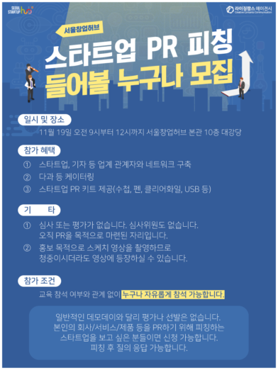홍보에이전시 라이징팝스는 오는 19일 마포구 공덕동 서울창업허브에서 열리는 데모데이에서 스타트업 피칭을 들어볼 일반 청중을 모집한다고 밝혔다.