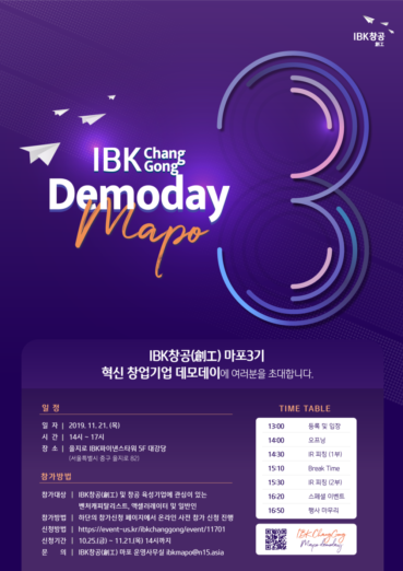 [11 21 목요일] IBK창공(創工) 마포 3 데모데이 = IBK기업은행 창업육성플랫폼 IBK창공(創工) 마포 3기 기업이 오는 21일 서울 을지로 IBK파이낸스타워에서 데모데이를 진행한다. 액셀러레이터 N15가 운영을 맡은 ‘IBK창공 마포 3기’ 육성기업이 지난 5개월간 성과와 향후 계획을 나누고 IR피칭, 부스 홍보, 네트워킹에 나설 계획이다. 벤처캐피탈리스트, 액셀러레이터, 기관투자자, 예비창업가, 스타트업 관계자가 다양하게 참석을 앞두고 있다. 행사 참가 신청은 이곳에서 할 수 있다.