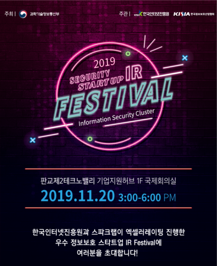[11 20 수요일] 정보보호 스타트업 IR 페스티벌 = 한국인터넷진흥원과 스파크랩이 액셀러레이팅한 우수 정보보호 스타트업이 모여 오는 20일 판교 제2테크노밸리 기원지원허브에서 IR Festival을 진행한다. 행사는 윤현준 우아한형제들 부사장이 스타트업을 위한 인사이트 특강으로 문을 열고 스타트업 10개사 발표와 콘텐츠 전시로 이어질 예정. 발표에 참여하는 정보보호 분야 우수 스타트업은 다음과 같다. ㅿ소재의맥=출력물 보안솔루션 ㅿ스파이스웨어=클라우드 정보보안 ㅿ쏘마=위협헌팅 플랫폼과 APT 공격 시뮬레이터 개발 ㅿ알파비트=비정형 데이터 암호화 솔루션 ㅿ에프원시큐리티=웹보안 정보보호 솔루션, 서비스 개발 ㅿ옥타코=생체인식 온라인인증 플랫폼 ㅿ와이키키소프트=PKI 기술기반 보안솔루션 ㅿ와임=정보 보안 전문 ㅿ제이슨=인공지능과 데이터 과학을 기반으로한 사이버보안과 IT ㅿ지엘디앤아이에프=보안분야 제품 기획, 개발, 영업과 기술 인증 분야 솔루션 컨설팅 ㅿ티엔젠=IoT를 위한 보안 솔루션과 서버 솔루션 ㅿ포에스텍=RFID 자동인식기술 기반 전문 IT 서비스