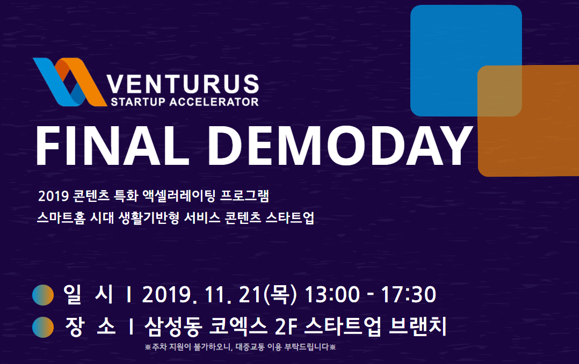 [11 21 목요일] 2019 벤처러스 파이널 데모데이 = 콘텐츠 특화 액셀러레이팅 프로그램 벤처러스가 프로그램 파이널 데모데이를 오는 21일 서울 삼성동 스타트업 브랜치에서 개최한다. 행사에 참여하는 IR 피칭기업은 ㅿ룰라비=실시간 음성 변조 기술을 활용한 유아 심리 상태 분석 서비스 ㅿ뉴올린로지스틱스=크라우드소싱 기반 퀵서비스 공유배송 플랫폼 ㅿ비디오몬스터=편집할 필요없이 3분이면 고퀄영상 제작이 가능한 온라인 영상 콘텐프 제작 솔루션 ㅿ컬처릿=실시간 움직임 추적 기술을 이용한 온라인 동작 훈련 및 교정 서비스 플랫폼 ㅿ디비비랩=고객이 직접 검증하는 UX 테스트 플랫폼 ㅿ캡슐미디어=단편 영상 기반 콘텐츠 제작 플랫폼 서비스 ㅿ씨엔에이=별도 앱설치 없이 무선 충전과 광고 주문이 가능한 스마트 오더 솔루션 ㅿ데브언리밋=AI 모션 캡쳐 기술을 이용한 K-POP콘텐츠 게임 개발 ㅿ알파서클=Real 8K 3D VR을 구현하는 VR 영상엔진 개발 및 엔진 기반 콘텐츠 제작이다. 행사에 대한 자세한 내용과 참가신청은 이곳에서 할 수 있다.