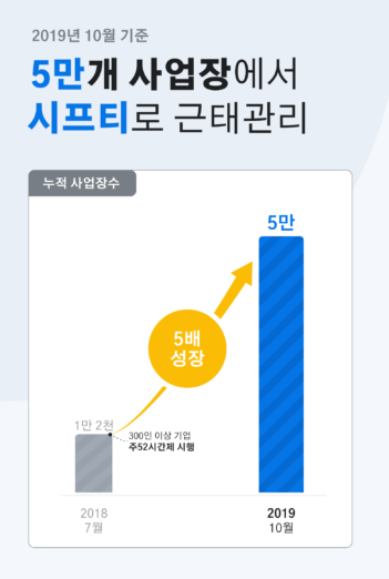 지난해 7월 1만 2,000개였던 사업장은 올해 동월 4만 개를 넘어섰으며 3개월 만에 1만 개 사업장이 증가했다. 주 52시간 근무제가 내년부터 50인 이상 사업장으로 확대됨에 따라 시프티를 도입하거나 시범 운영하는 기업이 급격히 늘어난 영향이다.