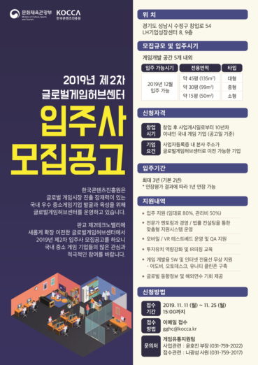 한국콘텐츠진흥원이 11월 25일까지 글로벌게임허브센터 입주사와 게임벤처 4.0 입주사를 함께 공개 모집한다.