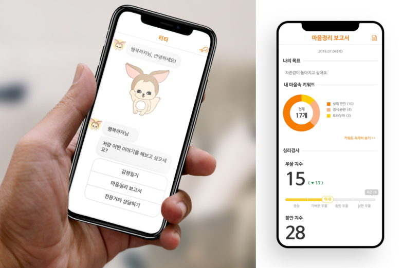 티티는 딥러닝과 자연어 처리 기술을 접목한 챗봇을 통해 누구나 무료로 감정 상태를 체크하고 마음 관리를 할 수 있게 해준다. 실제 전문 심리상담사의 답변 내용을 분석해 사용자 감정과 마음 상태에 필요한 심리 검사를 진행하게 돕는다. 대화형 데이터를 기반으로 한 사용자 맞춤형 보고서로 마음 상태에 맞는 솔루션도 자동 제안해준다.