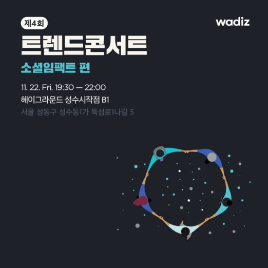 트렌드콘서트는 와디즈가 격월 단위로 한 주제를 선정, 해당 분야 전문가를 연사로 초청해 스타트업 투자 동향과 주요 트렌드를 나누는 행사. 지난 5월 와디즈는 온라인 커머스를 시작으로 7월 전시 투자, 9월 모빌리티를 주제로 행사를 진행한 바 있다. 이번 행사는 사회 긍정적 영향을 미치는 사업 혹은 기업에 투자하는 임팩트 투자와 사회 문제를 풀고 기회를 만드는 임팩트 비즈니스를 자세히 다룬다.