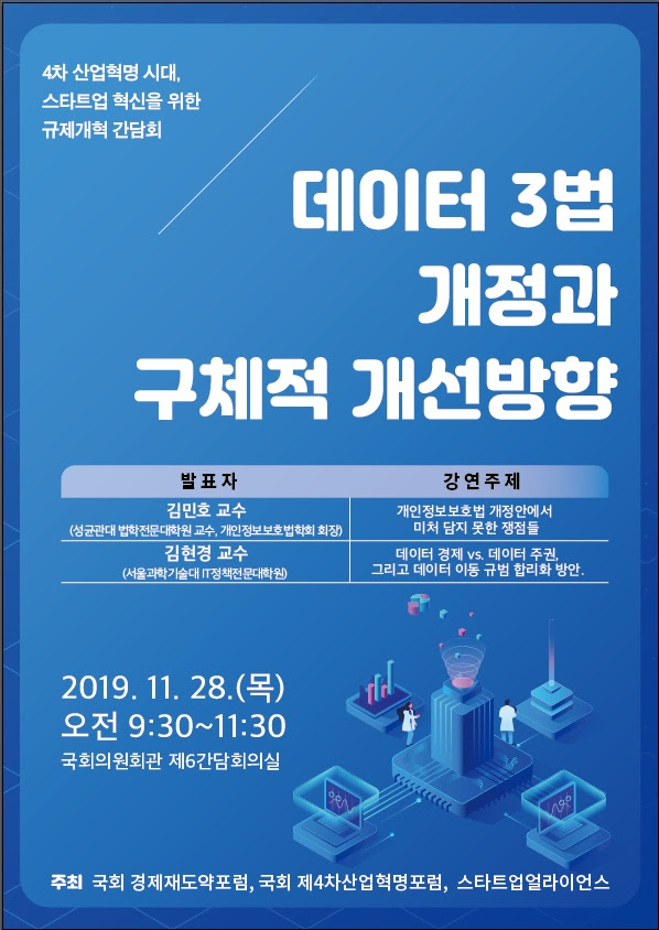 스타트업얼라이언스가 11월 28일 국회의원회관에서 국회 경제재도약포럼, 국회 제4차산업혁명포럼과 데이터 3법 개정과 구체적 개선 방향을 주제로 한 국회 간담회를 공동 개최한다.