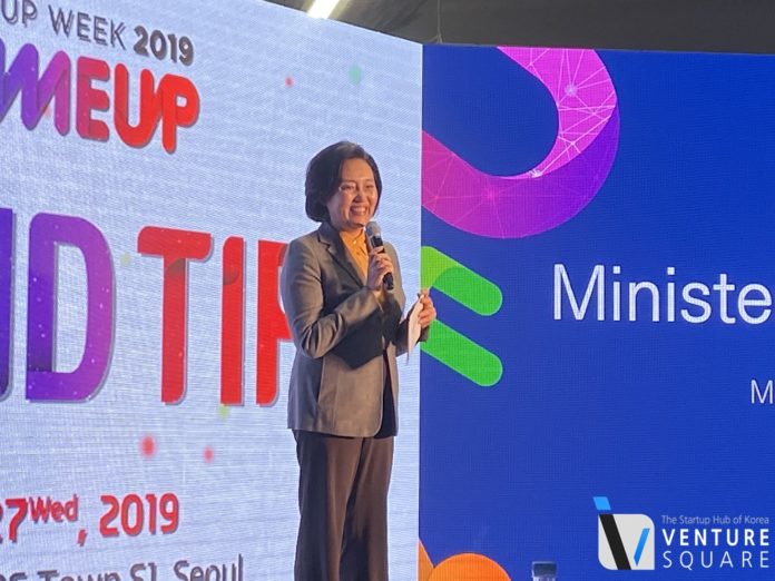 박영선 중소벤처기업부장관은 현장에 모인 국내외 스타트업, 투자자, 액셀러레이터에게 “중소벤처기업부를 작은 것을 연결하는 강한 힘”이라고 중소벤처기업부를 소개했다. 작은 것들이 모여 강한 힘이 되고 강한 힘이 사회를 바꿀 수 있을 것이라는 의견이다. 박 장관은 “1,2차 산업혁명 시대 까지는 인간을 대체해 모든 것을 빨리 진행하고 남보다 앞서 가는 것이 기업가의 목표였다”며 “3,4, 차 산업혁명을 완성하는 새로운 기업가 정신은 우리가 살고 있는 세상을 더 가치있게 만들고 서로를 도와주는 기업에 방점을 찍고 있다”고 전했다. 그런 의미에서 “중기부가 추구하는 같이 삽시다’ 브랜드는 가치를 나누고 (기업가들과) 함께 간다는 의미라고 할 수 있다”고 덧붙였다.