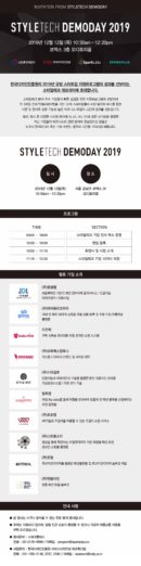◇[12월 12일 목요일] 2019 스타일테크 데모데이=올해 한국디자인진흥원 유망 스타트업 지원 프로그램 성과를 알리는 2019 스타일테크 데모데이가 오는 12일 코엑스 3층 오디토리움에서 열린다. 행사에서는 3개월간 액셀러레이팅을 받은 10개 스타일테크 스타트업이 피칭과 부스를 통해 비즈니스 모델과 성과를 선보인다.