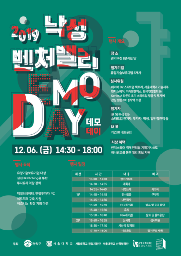 ◇[12월 06일 금요일] 2019 낙성벤처밸리 데모데이=관악구, 서울대학교, 서울대학교 창업지원단과 산학협력단, 벤처스퀘어, 관악창업공간이 주최하는 2019 낙성벤처밸리 데모데이가 오는 6일 관악구청 8층 대강당에서 열린다. 데모데이는 유망 기술 보유 기업 대상 실전 IR 피칭을 통한 투자 유치 역량 강화와 엑셀러레이터, 엔젤투자자 VC 네트워크 구축 지원, 비즈니스 확장 기회를 마련하기 위해 마련됐다. 유망 기술을 보유한 기업 8곳 IR에 참여하며 네이버 D2 스타트업 팩토리, 서울대학교 기술지주, 벤처스퀘어, 카카오벤처스, 한국엔젤협회까지 초기 스타트업 발굴과 투자에 관심이 많은 VC 심사역이 심사위원으로 참여한다. 시상식, 네트워킹 시간도 마련되는 본 행사에 대한 자세한 내용 확인과 참가 신청은 이곳에서 할 수 있다.