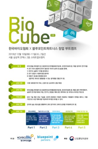 ◇[12월 10일 화요일] 한국바이오협회 X 블루포인트파트너스 창업 부트캠프=한국바이오협회와 블루포인트파트너스가 주관하고 산업통상자원부가 후원하는 바이오 창업 부트캠프가 오는 10, 11일 코엑스 2층 스타트업 브랜치에서 열린다. 이번 창업 캠프는 첨단 바이오 의약품 분야 연구자가 초기 회사 설립에 필요한 지식과 실습을 얻고 성공적 기업으로 발돋움하도록 밑거름을 만들어 주고자 한다. 참여 대상에는 세포 치료제, 유전자 치료제 개발을 비롯한 첨단 바이오 의약품 분야 예비 창업자, 실용적 연구를 목표로 하는 연구자, 창업을 계획하는 제약회사, 바이오 스타트업 직원이 해당한다. 행사에 대한 자세한 내용 확인과 참가 신청은 이곳에서 할 수 있다.