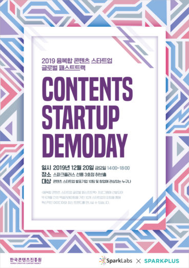 스파크플러스가 12월 20일 스파크플러스 선릉3호점에서 스파크랩, 한국콘텐츠진흥원과 2019 융복합 콘텐츠 스타트업 데모데이를 개최한다고 밝혔다.
