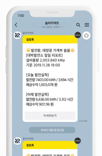 솔라커넥트 관계자는 “기존 솔라커넥트 태양광 대여사업 참가자에게 발송하던 일일 발전량 정보를 발전소 소유주에게도 보내자는 아이디어에서 출발했다. 솔라커넥트 IT팀은 앞으로도 발전소 소유주 편익을 위해 서비스를 지속 개발해 선보일 계획”이라 전했다.