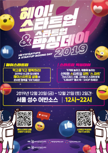 ◇[12월 20일 목요일] = 2019 HEY STARTUPS! & BOXING DAY = 헤이스타트업 재단이 서울창조혁신센터와 제주창조혁신센터와 함께 스타트업을 위한 행사 헤이 스타트업! & 박싱데이를 오는 20~21일까지 성수 어반소스에서 진행한다. 행사는 스타트업 종사자뿐 아니라 스타트업에 대해 잘 모르는 사람도 스타트업 제품을 만나고 경험하며 스타트업을 잘 알고 즐길 수 있게 구성했다. 헤이 스타트업은 남녀노소 모두 즐길 수 있도록 각 스타트업이 준비한 프로그램을, 박싱데이는 신박한 스타트업 제품을 판매하는 마트를 선보일 예정이다.