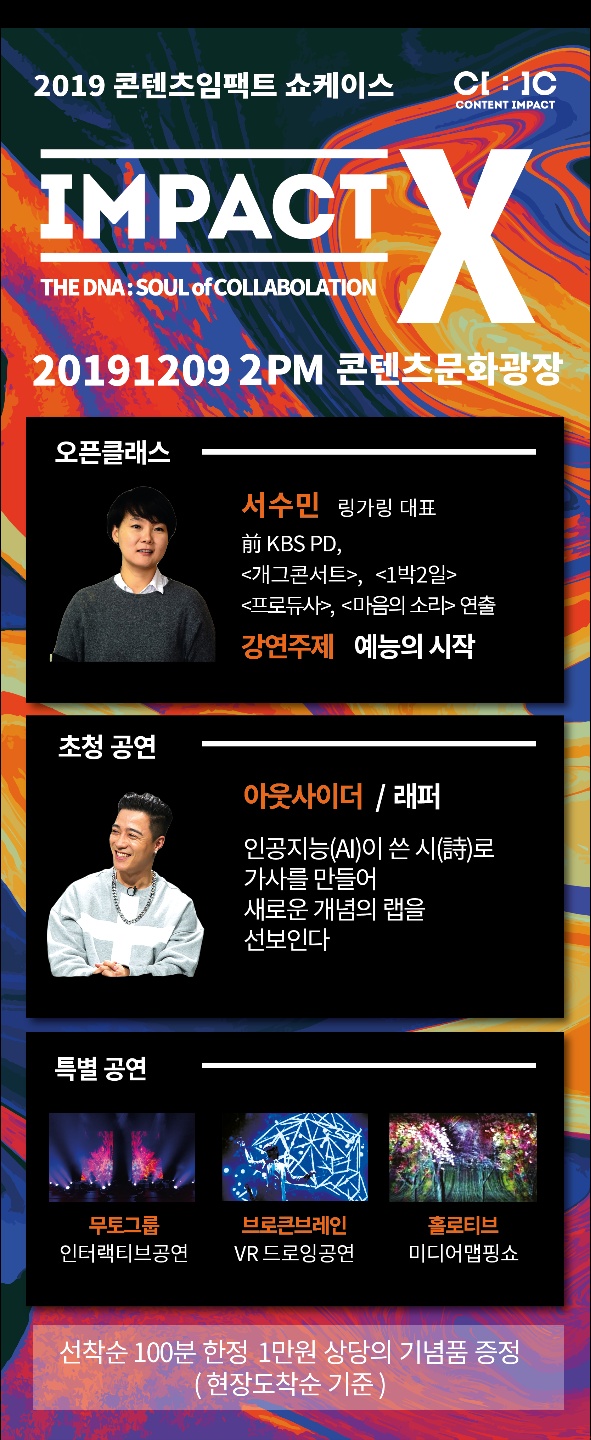 이번 행사는 콘텐츠임팩트 창의랩과 혁신랩 33개 프로젝트 주요 성과 발표와 공연, 시연, 전시 형태로 이뤄진 쇼케이스 형태로 진행한다. 눈길을 끌 결과물은 딥러닝으로 윤동주 시인의 시풍을 AI에 학습시키고 새롭게 시를 창작하거나 기존 시인 작품을 윤동주 시인풍으로 재창조한 AI×윤동주 프로젝트. 이번 쇼케이스에선 이를 래퍼 아웃사이더와 콜라보 공연으로 선보인다. 또 AI가 쓴 대본으로 이뤄진 웹드라마, 웹툰, 무빙튠도 소개한다.