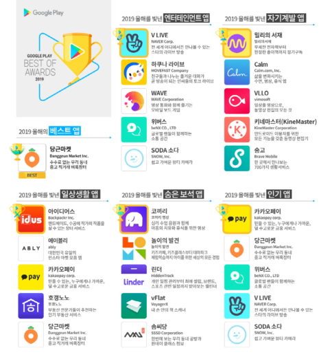 올해를 빛낸 앱 부문별 최우수상으로는 엔터테인먼트 분야는 브이라이브(V LIVE), 일상생활 앱은 아이디어스, 자기계발 앱은 밀리의 서재, 숨은 보석앱은 코끼리가 선정됐다. 또 올해를 빛낸 게임 부문별 최우수상은 경쟁 게임에선 브롤스타즈, 캐주얼 게임은 프렌즈 타운, 혁신적인 게임은 오토체스, 인디 게임은 서울 2033 : 후원자가 선정됐다. 또 온라인 유저 투표 결과를 바탕으로 한 2019 올해를 빛낸 앱·게임은 카카오페이와 브롤스타즈가 차지했다. 그 밖에 올해 신설한 인기 영화, 인기도서 부문에선 어벤저스 : 엔드게임과 박막례, 이대로 죽을 순 없다가 이름을 올렸다.
