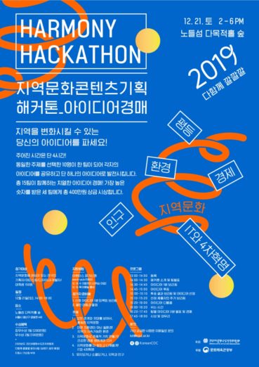 ◇[12월 21일 토요일] 2019 하모니 해커톤 : 지역을 변화시킬 수 있는 아이디어를 파세요!=코리아문화수도조직위원회가 주최하고 문화체육관광부가 후원하는 2019 하모니 해커톤이 오는 21일 노들섬 다목적홀 숲에서 열린다. 4시간 안에 같은 주제를 선택한 10명이 한 팀이 돼 총 15팀이 지역을 바꿀 아이디어 경매를 펼칠 예정. 지역 문화에 관심 있는 전국 기획자, 아티스트, 디자이너, 개발자, 대학생이 참가 가능하며 가장 높은 숫자를 받은 3팀에 상금이 수여될 예정이다.