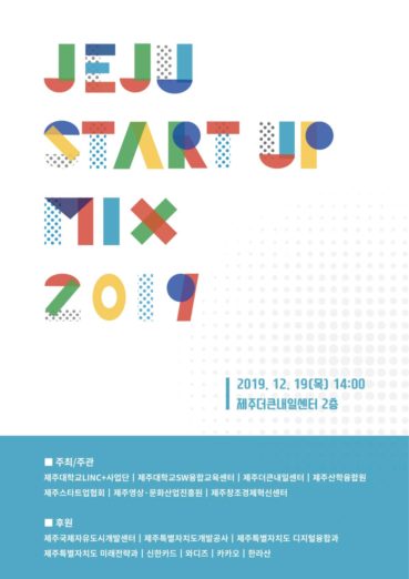 ◇[12월 19일 목요일] 제주 스타트업 믹스 2019 : 탐나는 청년과 제주 스타트업이 밝히는 제주의 미래=제주대학교 LINC+ 사업단과 6개 기업이 주최, 주관하는 제주 스타트업 믹스 2019가 오는 19일 제주더큰내일센터 2층에서 열린다. 제주 기업과 청년, 기관이 한자리 모여 상생하는 제주만의 스타트업 문화를 조성하는 것이 목표며 탐나는 청년과 제주 스타트업이 밝히는 제주의 미래를 부제 삼는다. 행사에는 제주 스타트업 실태조사 공청회, 제주 4차 산업혁명 전략 펀드 설명회와 같은 사전 행사와 간담회, 기관별 사업 발표와 서명식, 네트워킹과 경품 추첨이 예정됐다.