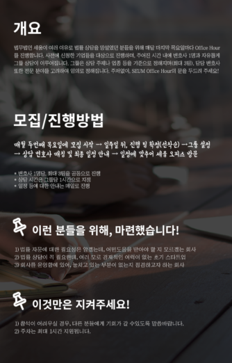 ◇[12월 26일 목요일] 법무법인 세움 오피스 아워=대형 로펌에서 근무하던 변호사가 스타트업을 위한 제대로 된 법률 서비스를 제공하고자 설립한 스타트업 전문 로펌 법무법인 세움이 오피스 아워를 연다. 이는 오는 26일 세움 오피스 내 회의실에서 진행하며 법률 상담을 망설이는 모든 회사에 무료 상담을 제공한다. 주어진 시간 동안 변호사 1명과 자유롭게 그룹 상담을 진행할 수 있고 많게는 3팀까지 상담 주제나 업종을 기준으로 그룹을 묶는다. 담당 변호사는 전문 분야를 고려해 임의로 정할 예정.