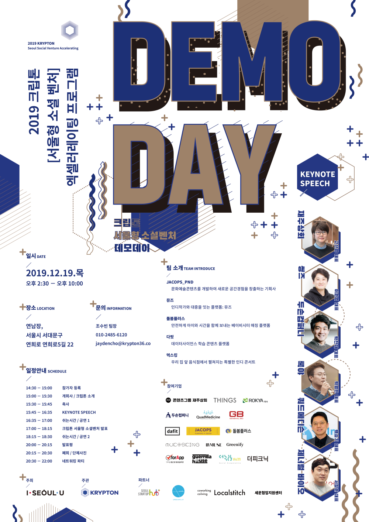 ◇[12월 19일 목요일] 크립톤 서울형 소셜벤처 데모데이=서울특별시가 주최하고 크립톤이 주관하는 2019 크립톤 서울형 소셜벤처 데모데이가 오는 19일 연남장에서 열린다. 행사는 혁신적인 접근을 통해 서울시 일자리 부족, 주거 불안 문제를 해결하는 동시에 소셜벤처 생태계에 성공 모델을 제시하고자 기획됐다. 국내 전문가 키노트 연설, 크립톤 서울형 소설벤처 스타트업 피칭, 네트워킹 시간이 진행될 예정.