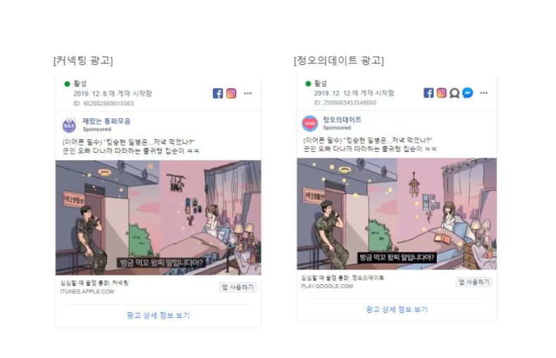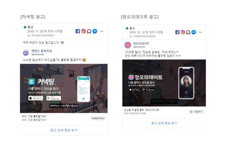 양 대표가 문제 삼은 통화 콘텐츠는 커넥팅이 자체적으로 제작해 올해 6월 말부터 페이스북 페이지에 노출한 콘텐츠로 10월부터는 일러스트와 함께 마케팅 목적으로 페이스북 유료 광고를 진행하고 있었다. 양 대표는 “정오의 데이트가 커넥팅의 통화 콘텐츠 목소리까지 그대로 다운받아 자사 콘텐츠에 사용했을 뿐만 아니라 일러스트 컨셉, 광고 카피, 문구까지 동일하게 베낀 것”이라고 지적했다.