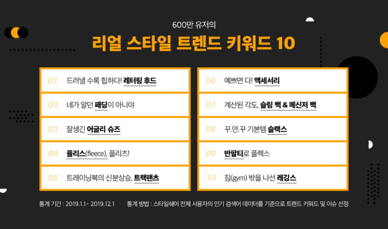 스타일쉐어는 일상과 가장 가까운 패션 정보가 공유되는 플랫폼이라는 자사 강점을 살려 이번 ‘2019 리얼 스타일 트렌드 리포트’를 발표했다. 올 1월 1일부터 12월 1일까지의 자사 검색어 데이터를 분석해 실제 밀레니얼·Z세대가 관심을 가졌던 패션 키워드를 도출했다.
