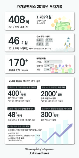 정신아 카카오벤처스 대표는 “2019년은 패밀리사들을 위한 밸류업을 고민하고 다양한 아이디어들을 실험한 한 해였다”며 “내년에도 활발한 투자활동과 더불어 패밀리사들의 든든한 동반자가 되도록 노력할 것”이라고 밝혔다.
