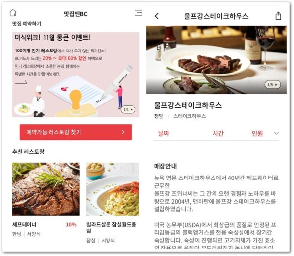 이번 행사는 BC카드가 간편 결제앱 페이북 내에서 지난 12월 15일부터 2주간 국내 유명 레스토랑 100여곳을 최대 60% 할인가에 즐기게 진행한 것. 테이블매니저가 운영하는 레스토랑 실시간 온라인 예약 플랫폼 마이테이블을 적용해 간편 예약이 가능했다. 원하는 레스토랑을 고르고 날짜, 시간, 인원만 입력하면 손쉽게 예약을 끝낼 수 있고 예약 취소나 변경도 가능하다.