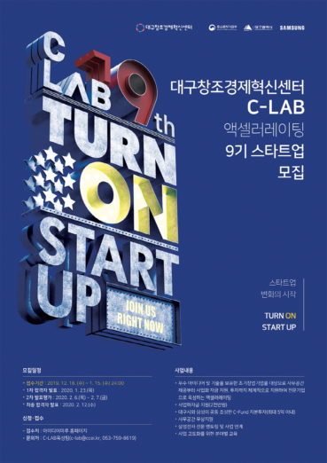 대구창조경제혁신센터가 1월 15일까지 C-LAB 액셀러레이팅 프로그램 9기를 모집한다.
