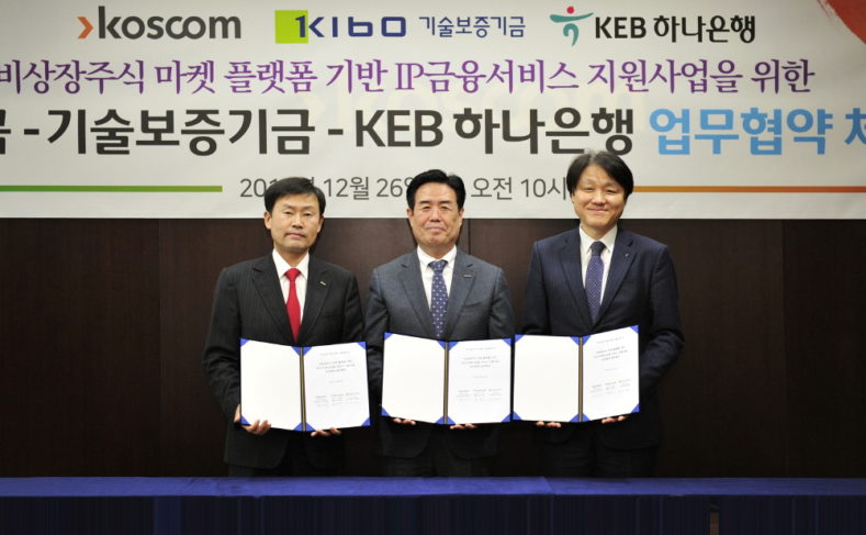 기술보증기금이 코스콤, 하나은행과 함께 비 마이 유니콘 등록 기업을 대상으로 지식재산 금융 우대 지원에 합의하고 12월 26일 업무 협약식을 가졌다.