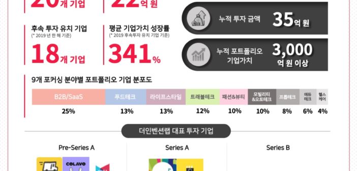 스타트업 액셀러레이터 더인벤션랩이 2019년 초기투자 실적 및 성과를 발표했다. 더인벤션랩은 KB국민카드, 웰컴금융그룹, 신용보증기금, LG CNS, 삼양홀딩스 등의 주요 대기업/중견그룹사와 공동으로 오픈 이노베이션(Open Innovation)프로그램을 운영하고 이와 연계하여 초기 투자를 집중적으로 해왔다. 더인벤션랩은 2019년 한 해 동안 20개 스타트업, 총 22억원의 초기 시드투자를 집행했다. 이중 18개 기업이 이후 후속 투자 유치를 통해 평균 341%의 성장세(투자 후 기업가치 기준)를 보이고 있다고 발표했다. 특히, 2019년 1분기에 조성한 베트남을 거점으로 동남아시아 신흥시장에 진출하는 국내 초기 스타트업에만 투자하는 ‘베트남신기술투자조합’을 통해 6개 기업에 투자를 집행, 오케이쎄(OKXE, 베트남 중고 오토바이 거래플랫폼), 고투조이(Go2Joy, 베트남 2030연인대상 호텔대실/예약서비스), 고미(Gomi, K뷰티관련 제품 입점몰) 등이 프리 시리즈 A(Pre-Series A) 이상 기관 후속투자 및 팁스(TIPS) 프로그램에 선정됐다. 김진영 더인벤션랩 대표는 “2020년에는 베트남과 함께 부상하는 미얀마를 두 축으로 삼아 투자조합을 신규로 결성하여 규모를 키우고 자체 베트남 진출 프로그램인 라이징엑스(Rising X)와 연계하여 신흥 아시아 시장에 진출코자 하는 양질의 스타트업 팀을 적극 육성 할 것"이라고 말했다.