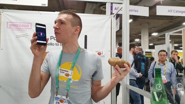 장난이 아닐까 싶은 이 제품은 바로 세계 최초의 스마트 감자다. 안테나를 생감자에 꽂고 블루투스를 통해 앱으로 연결한 후 감자에게 질문을 하면 앱을 통해 감자가 답을 해준다는 설명이다. 질문에 대한 답은 예 또는 아니오로 나온다. CES에서 스마트 기기가 쏟아져 나오지만 정작 많은 문제를 해결하지 못한다는 것을 지적하기 위해 나왔다는 대표의 말은 사실인 듯 보였다. 스마트 감자 기기는 현재 인디고고 캠페인 중이기도 하다.