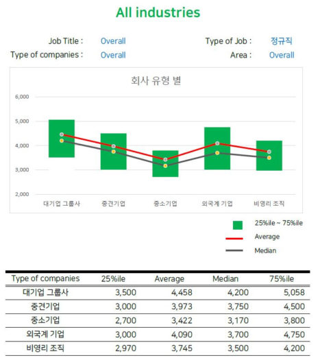 이번 보고서는 연봉 정보 21만 1,978건을 분석한 것. 기본급 정보를 지역·기업 유형별로 분류해 1∼13년차 평균 연봉, 연봉 중간값, 25%와 75% 지점 연봉값 등을 담았다. 이를 통해 수도권과 비수도권 연봉차, 대기업과 중소기업, 외국계 기업 연봉 수준 등을 확인할 수 있도록 했다.