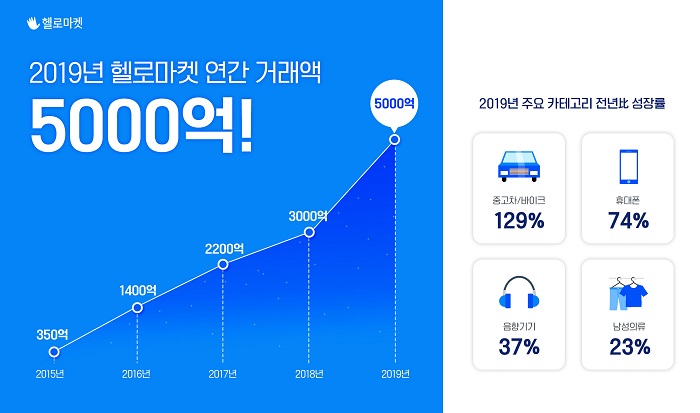 헬로마켓이 2019년 거래액 5,000억원을 달성했다고 밝혔다. 지난 2018년 거래액 2,971억원보다 67% 성장한 성과를 거둔 것.