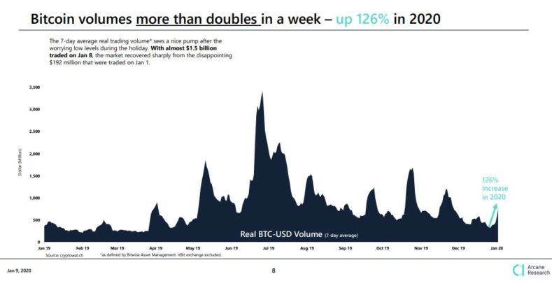 ◇ 투자 심리 회복?…BTC 거래량, 올들어 2배 증가=올해 1월 1일부터 일주일간 비트코인(BTC) 거래량이 전주보다 2배 이상 늘어난 것으로 나타났다. 프랑스 시장조사업체 아케인 리서치는 최근 보고서를 내고 올해 들어 7일간의 1일 평균 거래량이 전주보다 126%나 증가했다고 전했다. 또 1월 1일 1억9,200만 달러였던 1일 평균 거래량은 8일 약 15억 달러까지 치솟았다. 아케인 리서치는 “시장이 빠르게 회복되고 있다”고 설명했다.