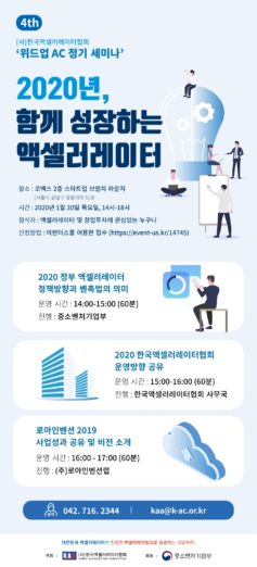 ◇[1월 30일 목요일] = 위드업 AC 정기 세미나 = 한국액셀러레이터협회가 주최하고 중소벤처기업부가 후원하는 위드업 AC 정기 세미나가 오는 30일 코엑스 2층 스타트업 브랜치 라운지에서 열린다. 행사에는 올해 정부 액셀러레이터 정책 방향과 지난 10일 국회 본회의에서 통과된 스타트업과 벤처기업 투자 활성화를 위한 벤처투자촉진법(이하 벤촉법)의 의미, 올해 한국액셀러레이터협회 운영 방향 공유, 로아인벤션 지난해 사업 성과 공유, 비전 소개가 진행된다. 액셀러레이터와 창업 투자에 관심 있는 누구나 참여할 수 있다.